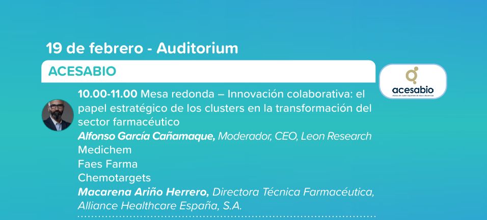 Uno de los momentos más relevantes tuvo lugar el 19 de febrero en el Auditorium, con la celebración de la mesa redonda de ACESABIO titulada “Innovación colaborativa: el papel estratégico de los clusters en la transformación del sector farmacéutico”. La sesión fue moderada por Alfonso García Cañamaque, CEO de Leon Research y entidad socia del Cluster SIVI.