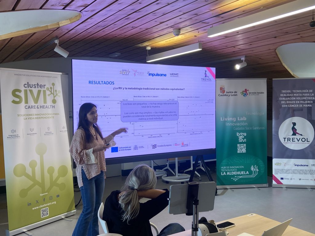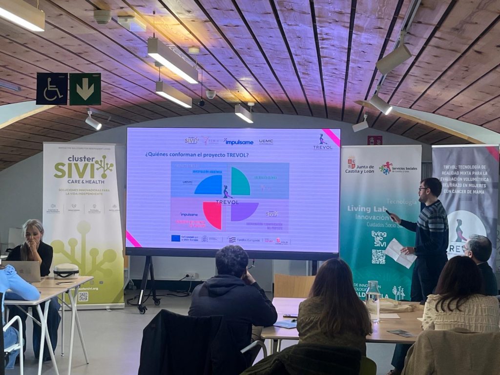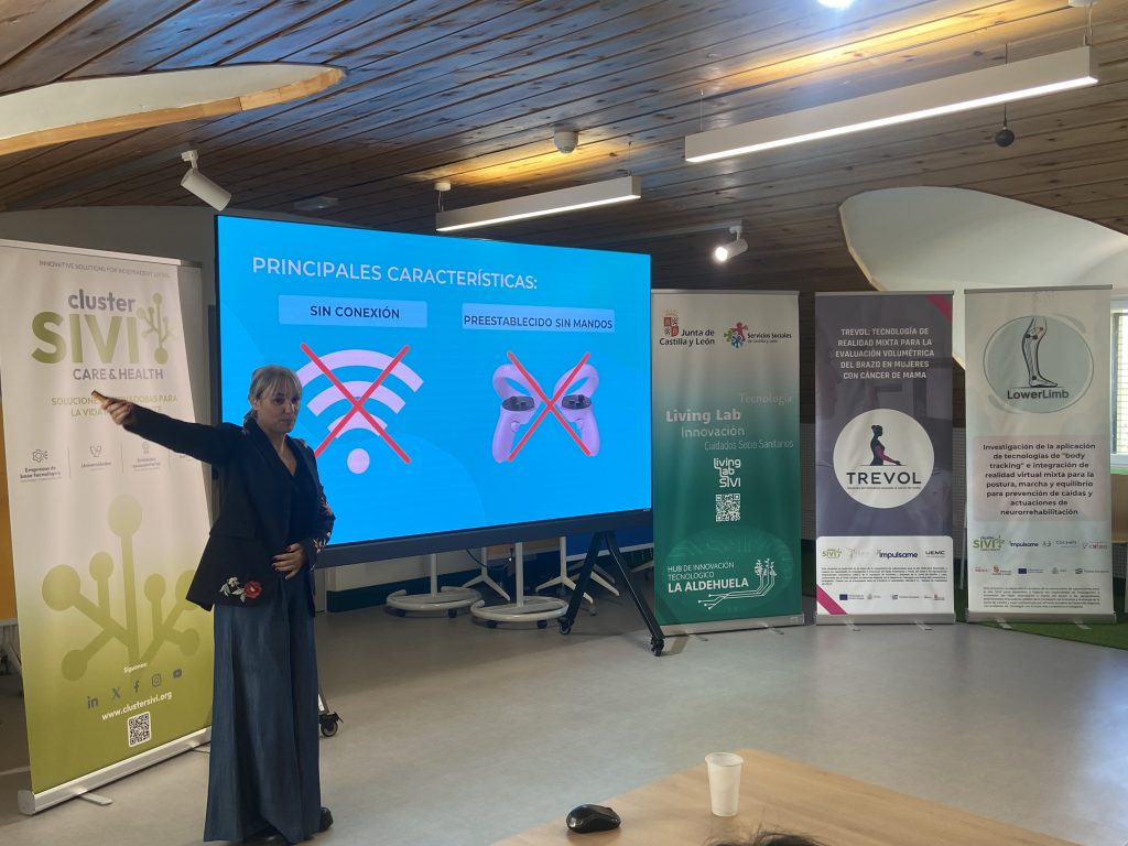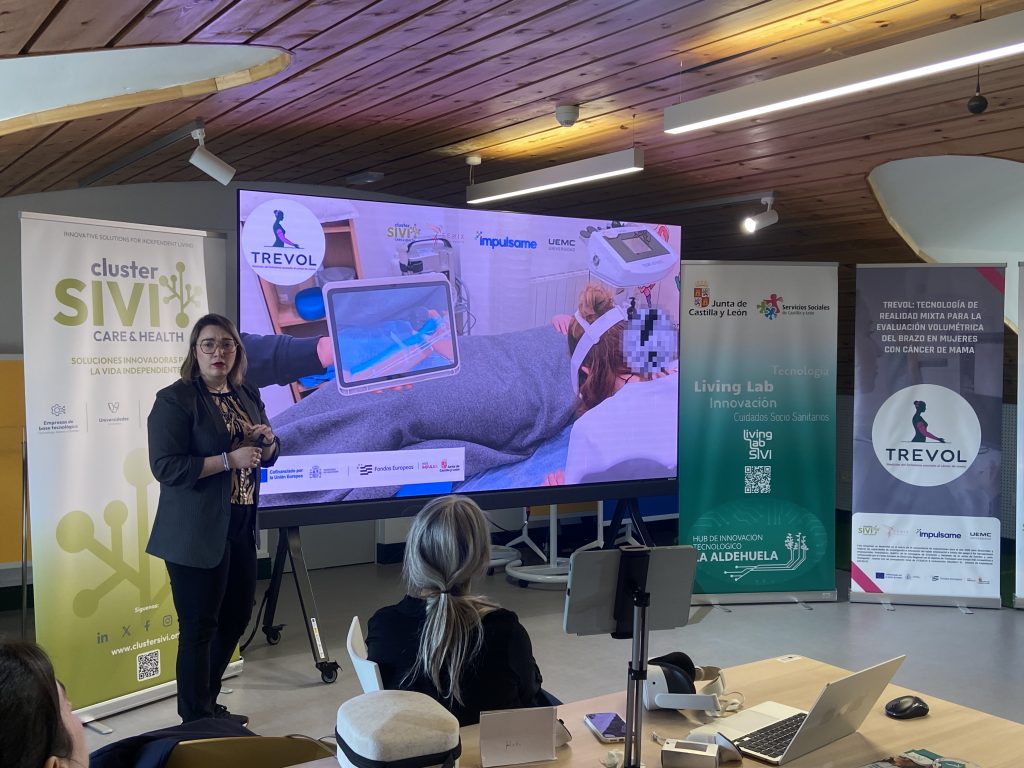 Uno de los momentos más destacados de la mañana fue la presentación del Proyecto TREVOL, una solución de realidad virtual mixta aplicada a mujeres con cáncer de mama, que se expuso ante profesionales del sector, complementando de una forma más práctica la presentación general realizada el pasado viernes en la UEMC. Esta sesión permitió profundizar en sus aplicaciones prácticas, su enfoque terapéutico y su potencial impacto en la mejora del bienestar y la calidad de vida de las pacientes.