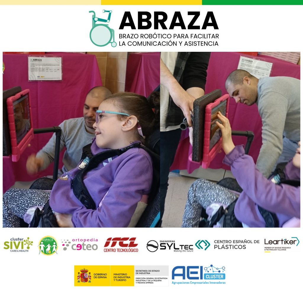 Estos prototipos se han desarrollado en el marco del proyecto colaborativo ABRAZA, que tiene como objetivo diseñar una solución robótica que inicie y sostenga el sistema de comunicación de las personas usuarias de por vida, desde edades tempranas del desarrollo, como medio de relación con el mundo, futuro acceso a redes sociales, a través del teclado y la lecto-escritura, al control domótico de su hogar y como instrumento de aprendizaje, independientemente del acceso comunicativo de la persona (eye tracking, digital, conmutadores,…) y/o las características físicas y técnicas de su silla de ruedas.